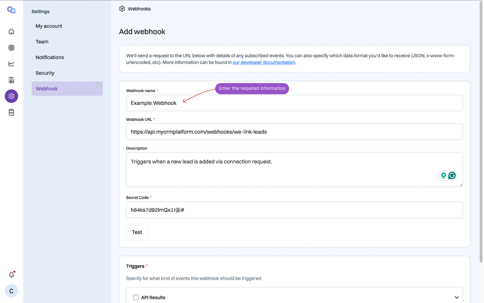- Secret code: This is a string used to verify the authenticity of webhook calls. You can generate a secure token from your system or ask your developer to provide one. We-Link will use this code to sign webhook payloads, and you can use it on your end to validate that requests are legitimate.