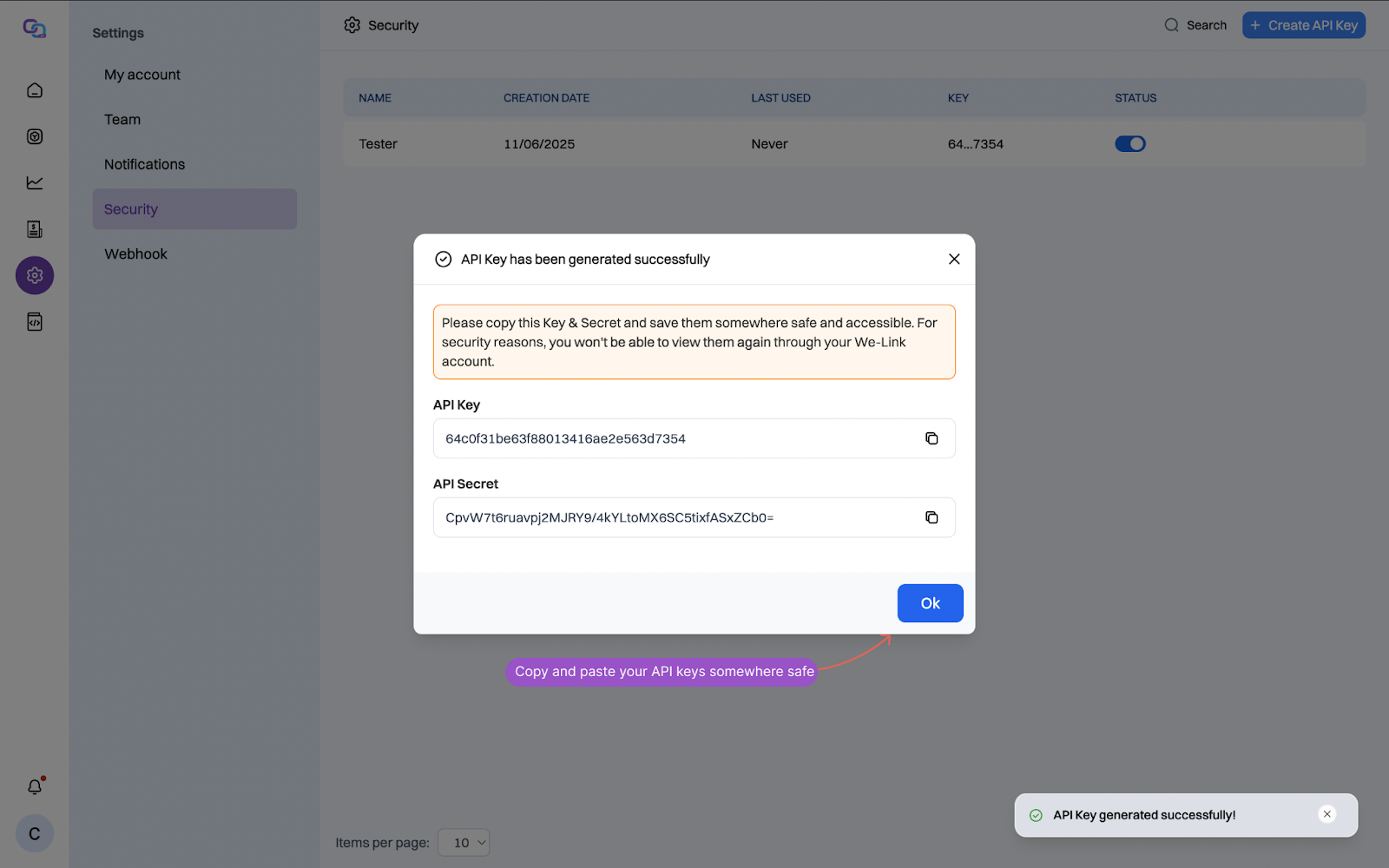 From your We-Link dashboard, head to Settings → Security. Then click the Create API Key button to begin.